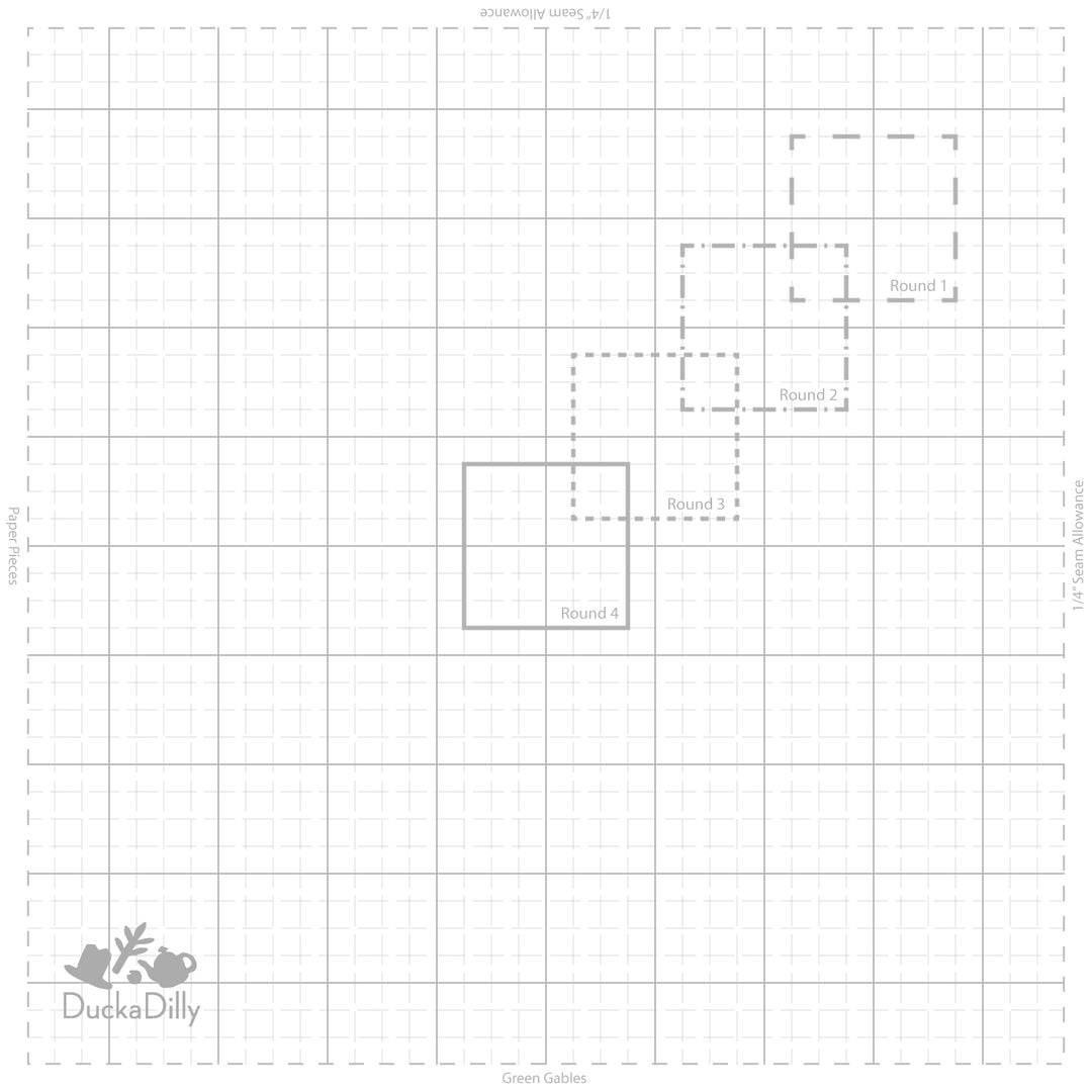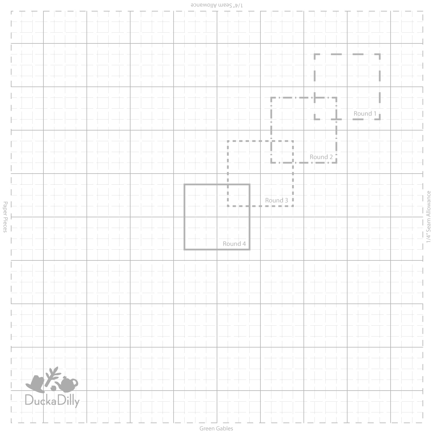 This acrylic template is for use with the Green Gables or Avonlea Log Cabin Quilt.  Ideal for helping with trimming at all points of block construction, this rulered acrylic has been specifically designed for this quilting project.  It includes clear marks for lining up your central square to ensure a precise trim after each round of "logs."