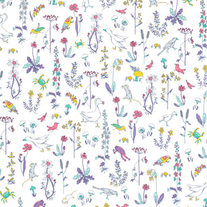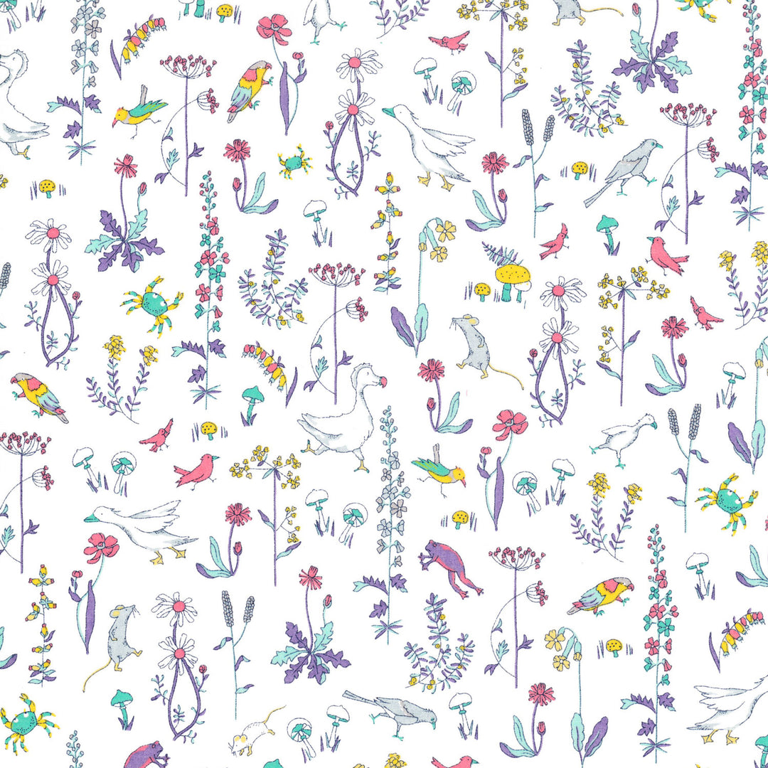 Theo is a hand-drawn conversational print created by Tamara de Peon for Liberty Fabrics, inspired by Lewis Carroll’s beloved classic Alice’s Adventures in Wonderland. The design incorporates colourful creatures running pell-mell around the fabric as if part of the Caucus Race.