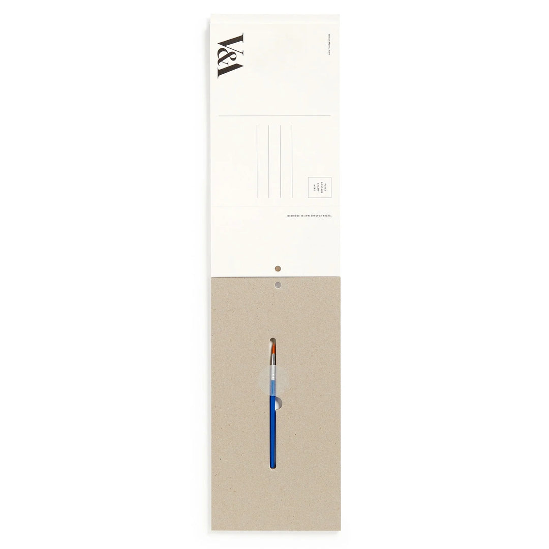 The William Morris Paint In Card Set includes a set of 6 cards featuring the iconic floral designs of William Morris that can be painted using the 6 colors embedded into the top of the card.